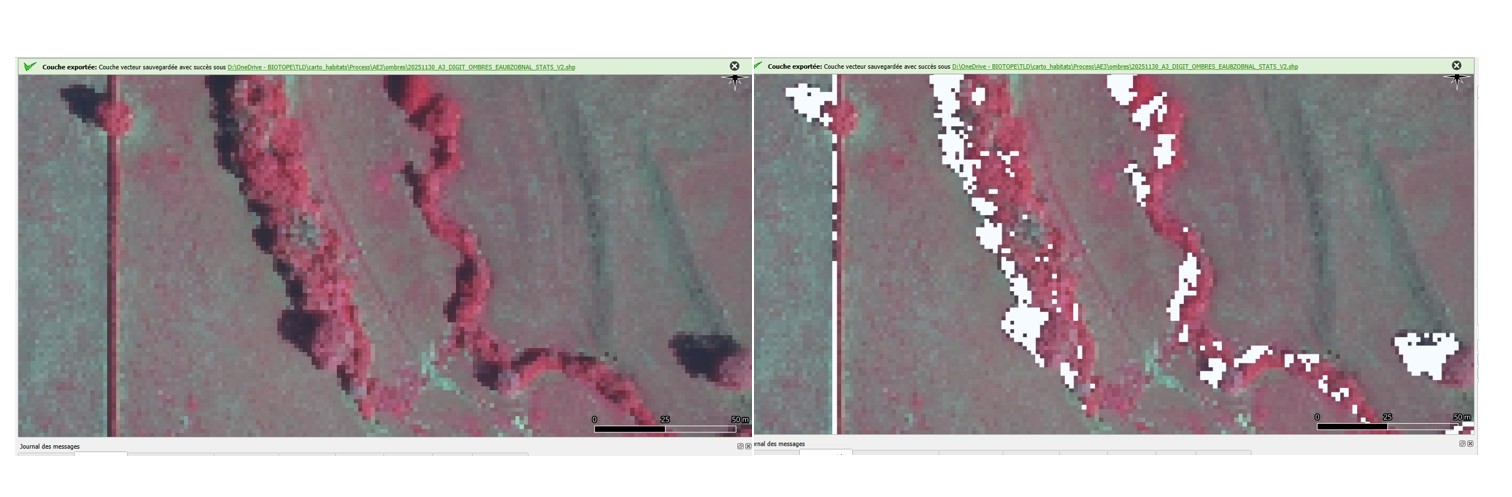 One of the problems comes from shadow (especially from trees) which affects the segmentation results. Based on an analysis of the spectral signatures of the shadow pixels, I managed to generate a mask of these pixels.I paste below a screenshot showing the aerial data + the aerial data with this cloud mask.